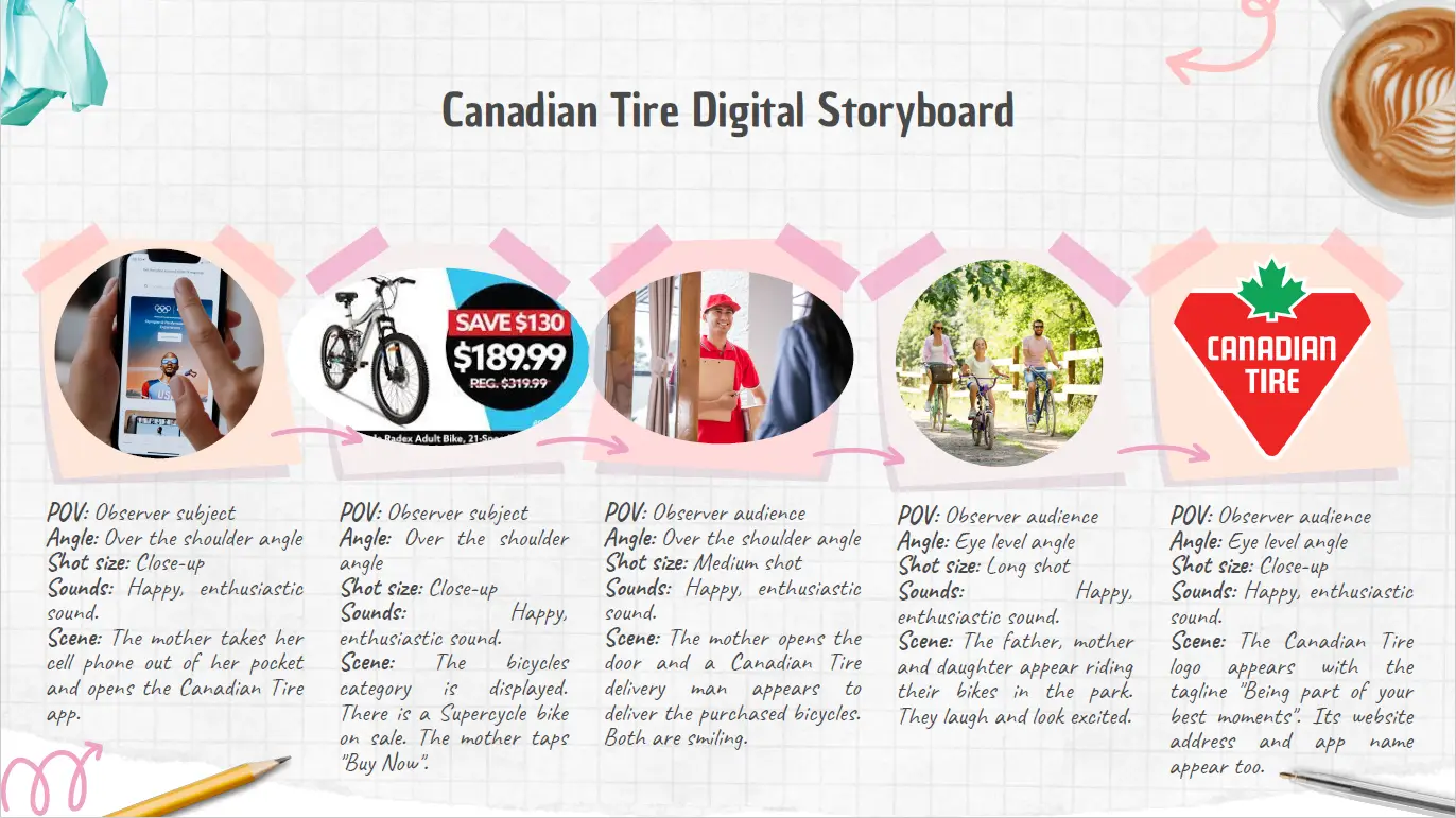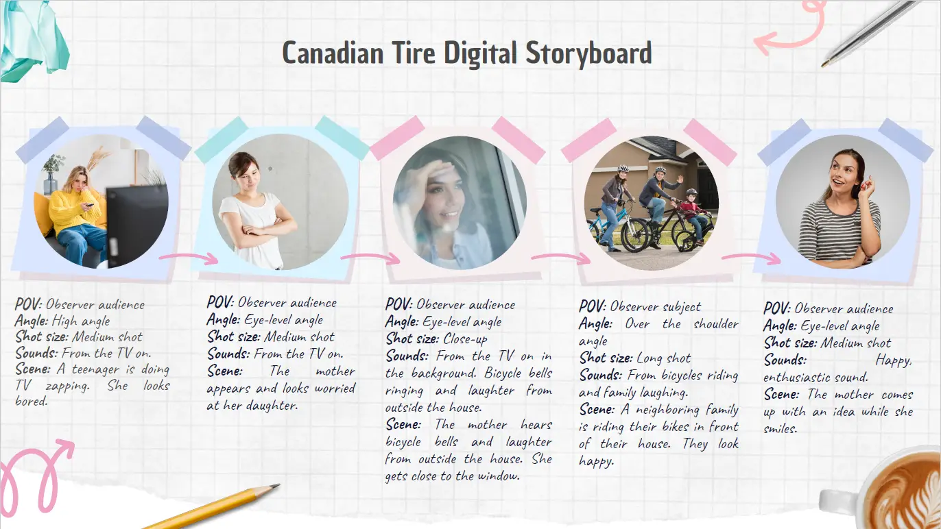 After collaboratively drafting the storyline, I designed my digital storyboard, including the frames of each shot that would be in the TV advertisement, defining the POV (Point of View), the camera angle, the shot size, the sound, and scene objectives.