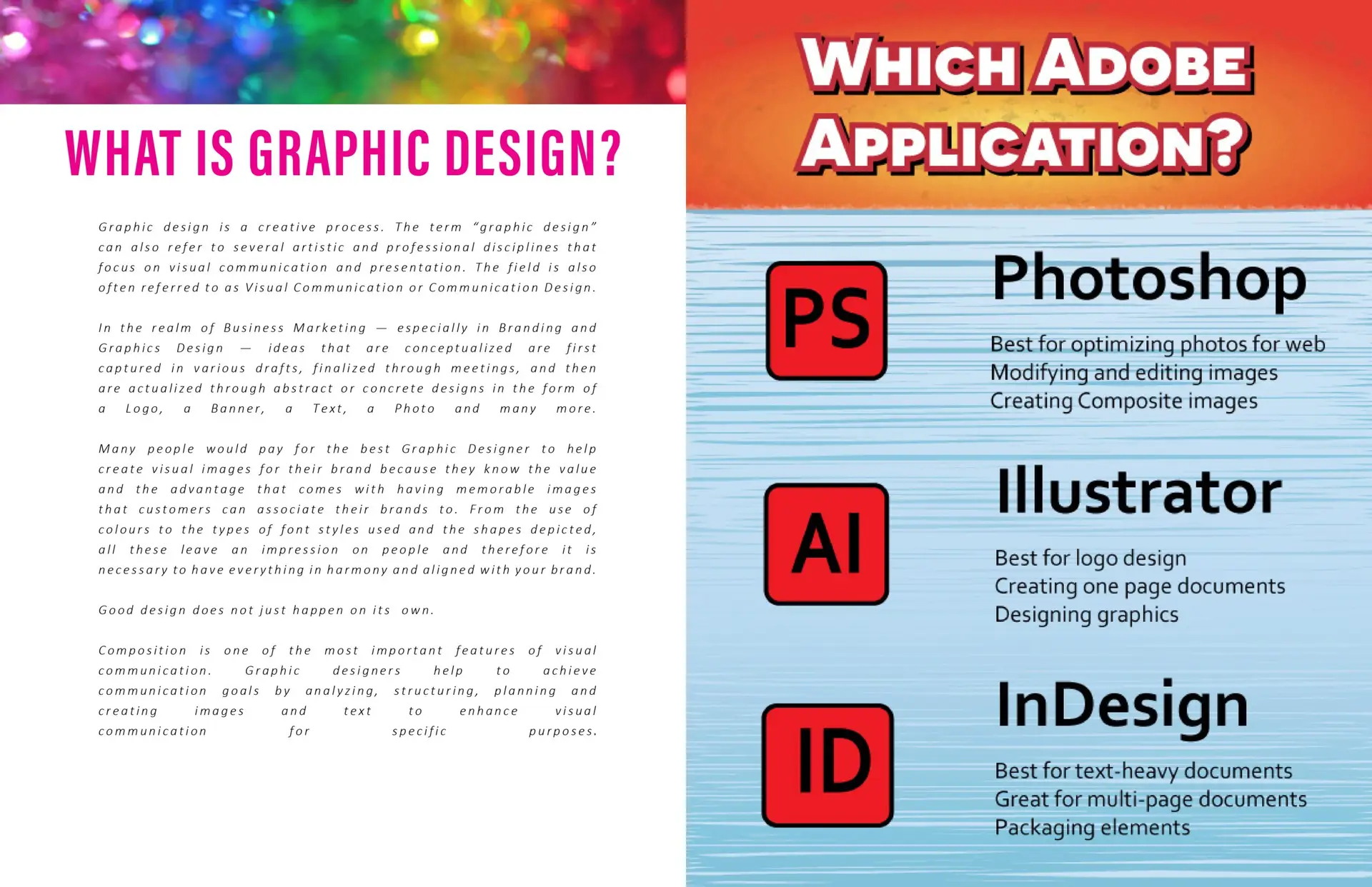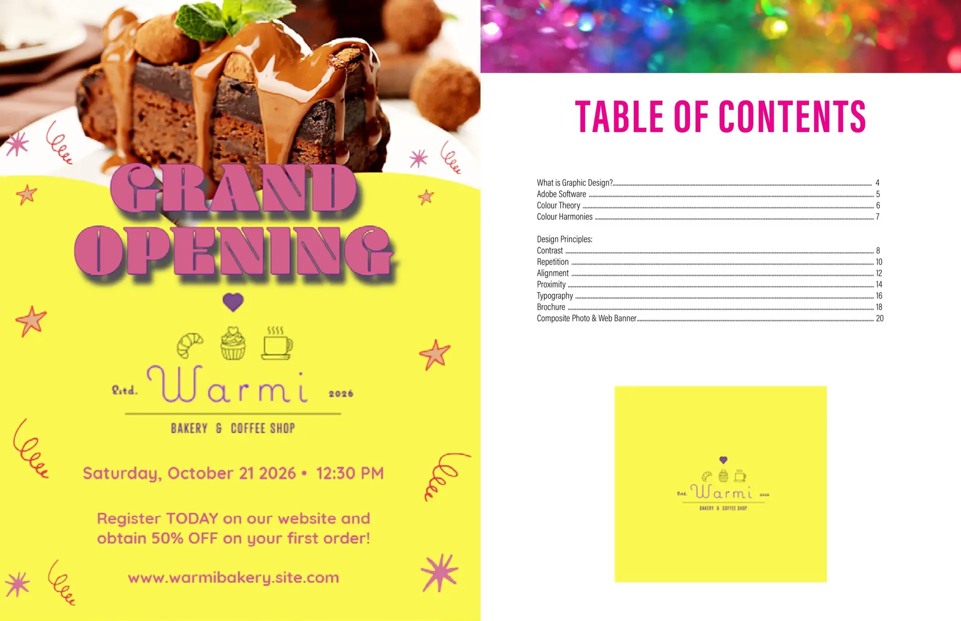 This guide-style project showcases my work from the Graphic Design for Marketers course, combining creativity with my ability to apply design principles, colour theory, and branding through projects created in Adobe Photoshop, Express and InDesign. An eye-catching logo and print ads, as well as a branded brochure, flyer, and web banner were created, with each piece reflecting not only technical skill but also a clear marketing vision.